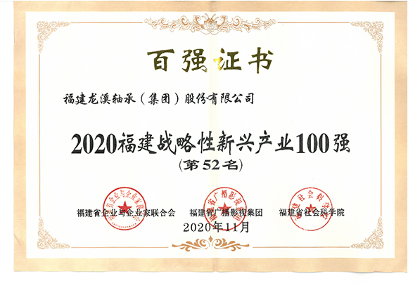 2020年11月20日,2020福建企業100強發布大會暨福建企業家大講壇在寧德市舉辦。會上,福建省企業與企業家聯合會聯合、福建省社會科學院、福建省廣播影視集團聯合發布的“2020福建戰略性新興產業領軍企業100強”榜單中,福建龍溪軸承(集團)股份有限公司位列榜單第52名。