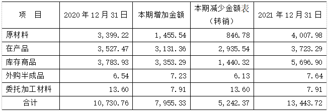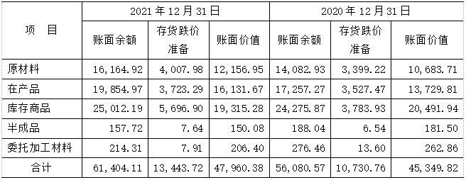 資產(chǎn)負(fù)債表日,公司對各項(xiàng)存貨的成本與可變現(xiàn)凈值比較,存貨成本高于其可變現(xiàn)凈值的,計提存貨跌價準(zhǔn)備,計入當(dāng)期損益。2021年公司存貨分類情況如下表(萬元):