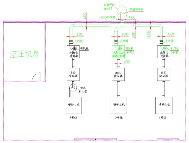 1)我司現有三條噴砂線,其中有兩臺為含水除塵設備,另一臺不含水除塵設備。本次噴砂粉塵處理系統(tǒng)需配備一臺水除塵設備,并將三條噴砂線的尾氣引外排放,且滿足三條噴砂線同時運行排氣的需求。