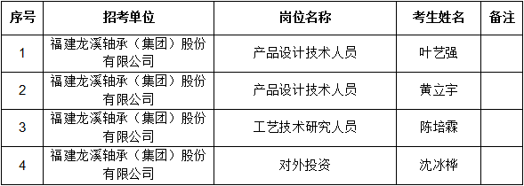 根據(jù)《福建龍溪軸承(集團(tuán))股份有限公司2022年公開招聘方案》有關(guān)規(guī)定,經(jīng)面試等程序,現(xiàn)將公司擬聘用人員予以公示,公示期為5個(gè)工作日,公示名單如下: