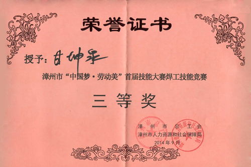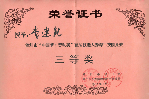 2014年9月24~25日,福建龍溪軸承(集團)股份有限公司派出6名員工參加了漳州市“中國夢·勞動美”首屆職工技能大賽焊工技能競賽,甘坤泉與李建能二名選手在緊張激烈的角逐中脫穎而出,榮獲三等獎。