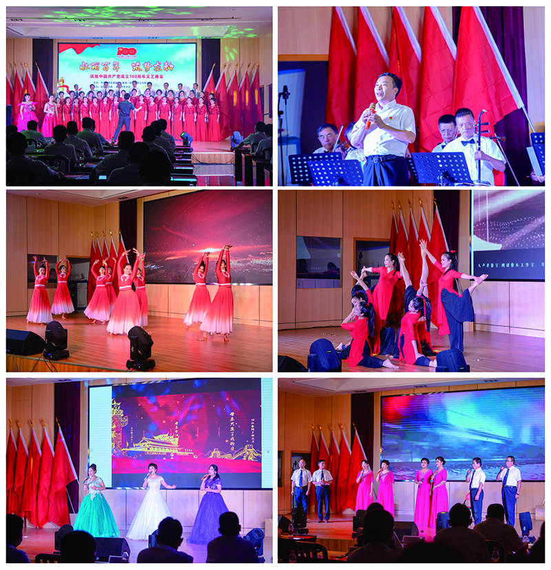 在大合唱《太陽最紅,毛主席最親》中,晚會拉開帷幕,接著,器樂合奏、獨唱、舞蹈、二重唱、男女聲四重唱、瑜伽表演等節目紛紛閃亮登場,演員們精彩的表演獲得了在場觀眾陣陣掌聲。最后,一曲《沒有共產黨就沒有新中國》將晚會推向高潮,全體觀眾情不自禁起立齊聲高唱,伴隨著節奏揮舞手中的黨旗,舞臺上下匯成一片紅色的海洋,展現了龍軸人對黨的無限熱愛、無限忠誠。