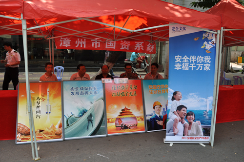 按照《漳州市人民政府安全生產(chǎn)委員會辦公室關(guān)于做好安全生產(chǎn)宣傳咨詢?nèi)栈顒拥耐ㄖ肪瘢?月9日早上,我公司代表國資系統(tǒng)參加漳州市2013年安全生產(chǎn)宣傳咨詢?nèi)栈顒樱谑袇^(qū)延安北路繁華路段設(shè)置咨詢點,舉行安全生產(chǎn)知識咨詢活動。主要活動內(nèi)容有:分發(fā)安全生產(chǎn)宣傳資料;安全生產(chǎn)知識咨詢;謎語競猜;安全月主題展等。