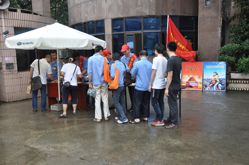 (圖b)志愿者在公司南大門,為公司員工分發(fā)安全生產(chǎn)宣傳資料。